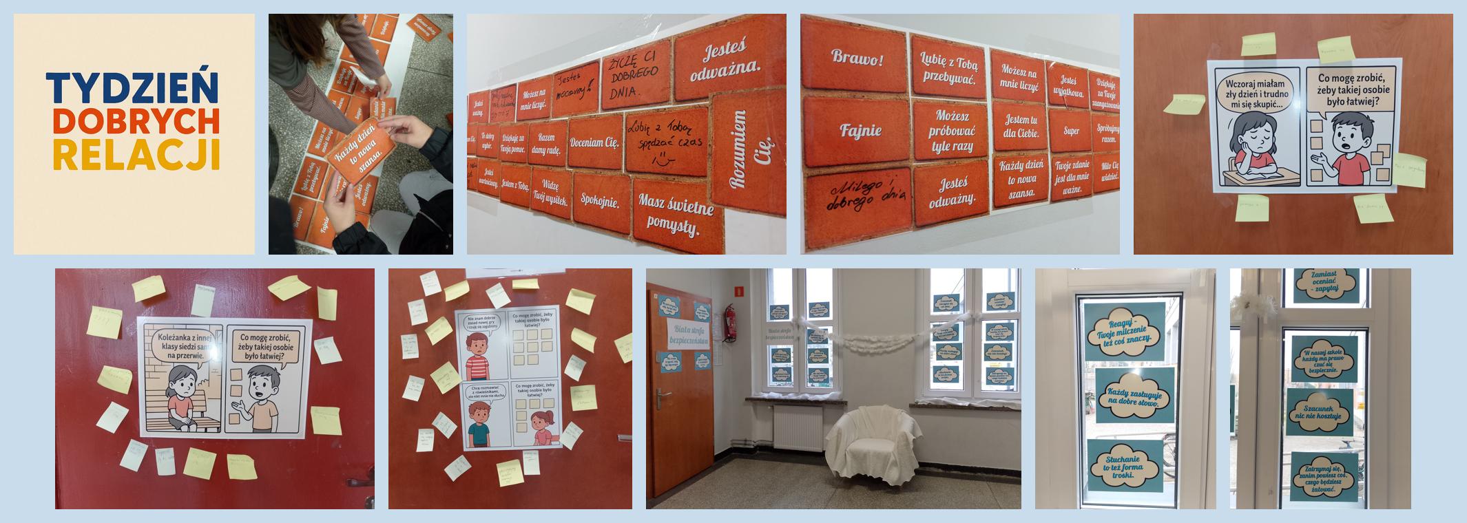 MURU DOBRYCH SŁÓW – miejsca pełnego pozytywnych komunikatów i życzliwych zdań, które uczniowie przyklejali i umieszczali wspólnie, tworząc symboliczne „cegły” dobrej atmosfery. Mur przypominał, jak dużą rolę w budowaniu relacji odgrywa język oraz jak nawet krótkie, dobre słowo może wpłynąć na czyjś dzień i poprawić atmosferę w szkole.